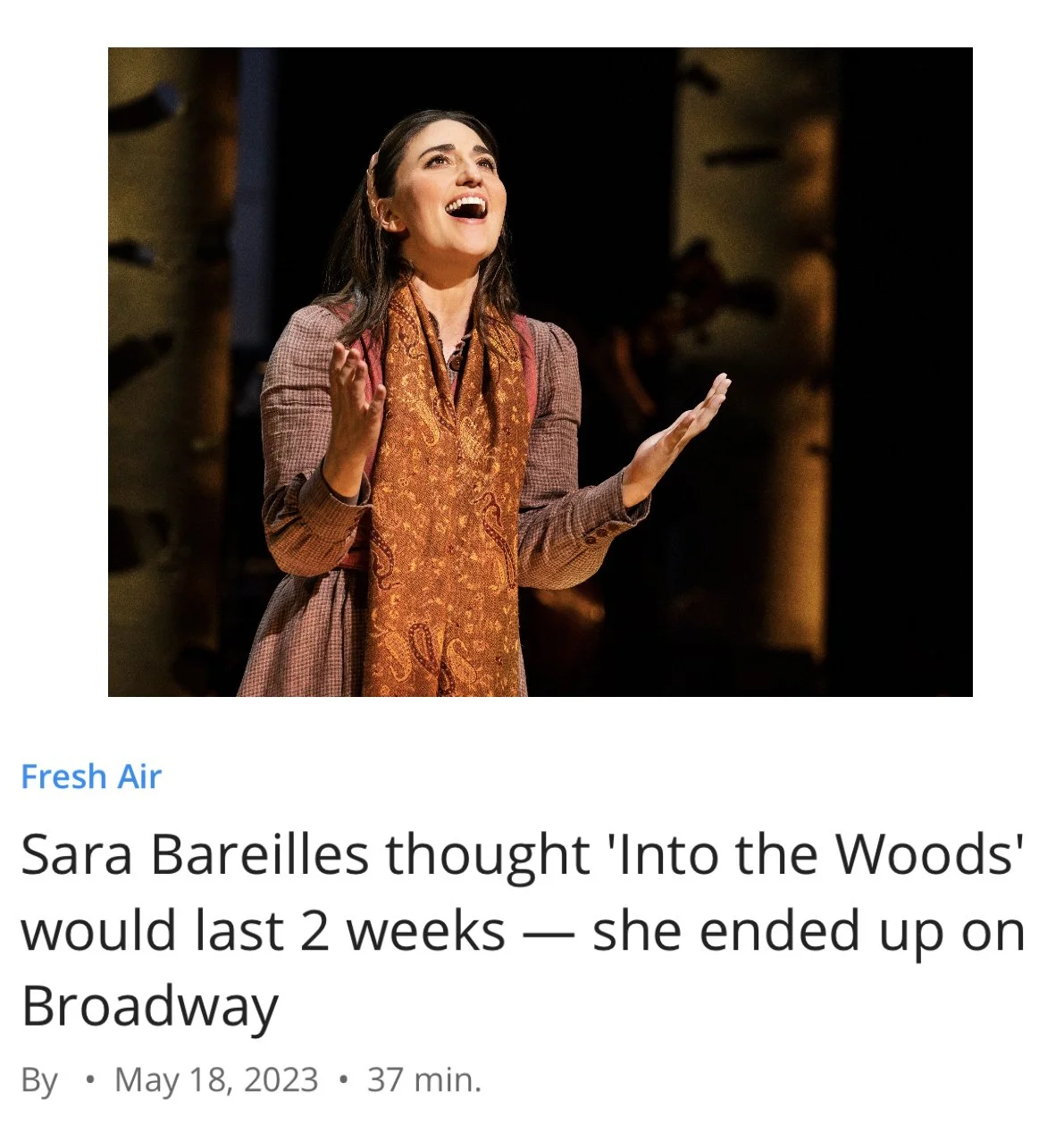 Sara says it much more elegantly in this podcast http://www.wnyc.org/story/sara-bareilles-thought-into-the-woods-would-last-2-weeks-she-ended-up-on-broadway/ than I ever could but I want to share my POV here.